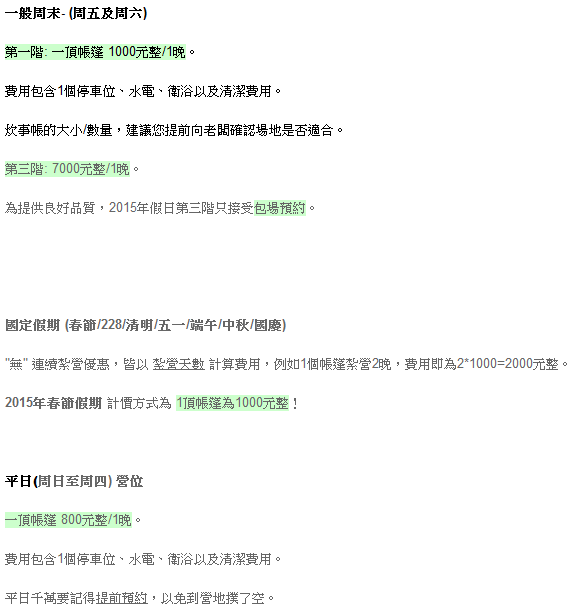 以下營地收費資訊來自於官網。